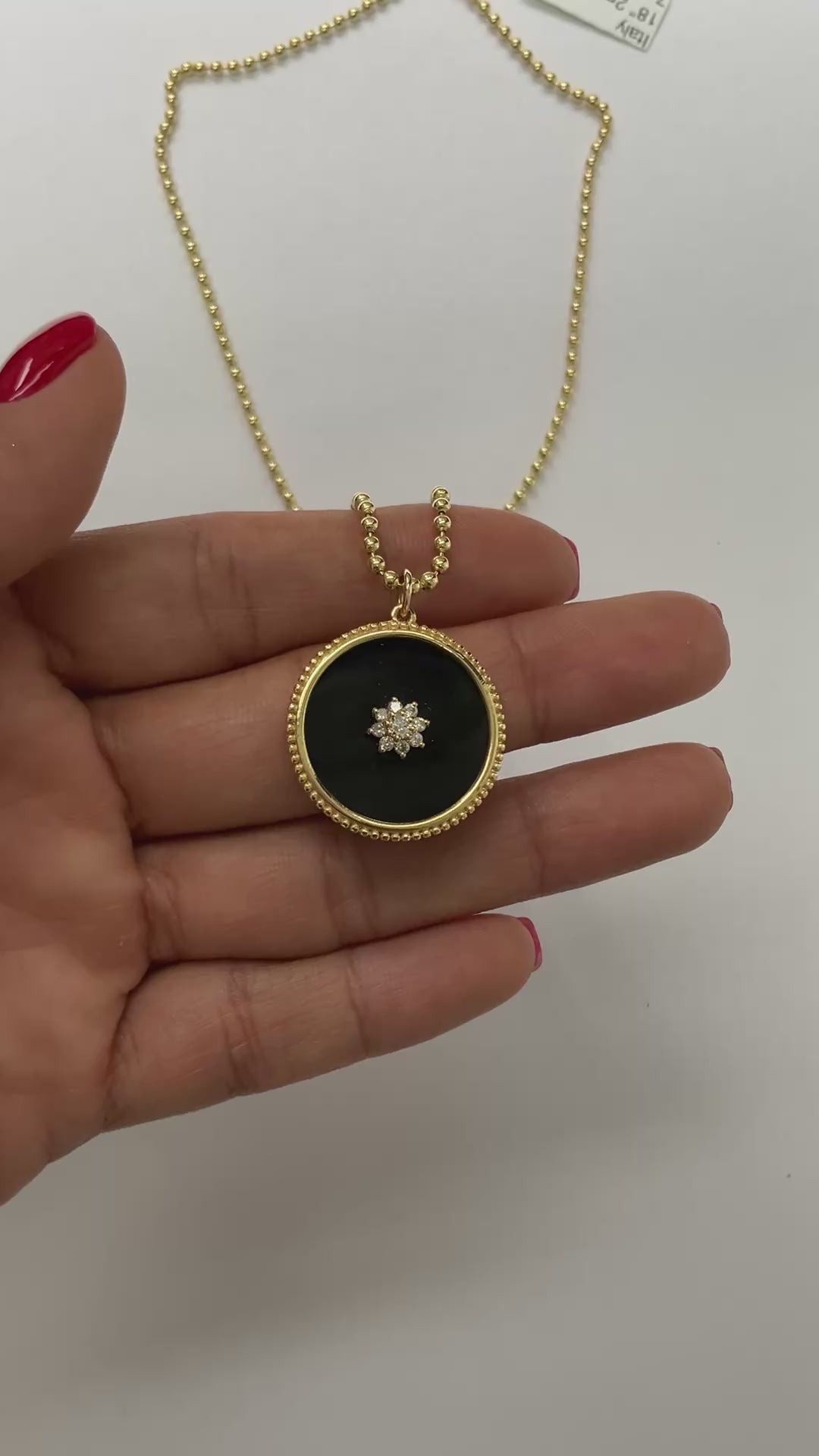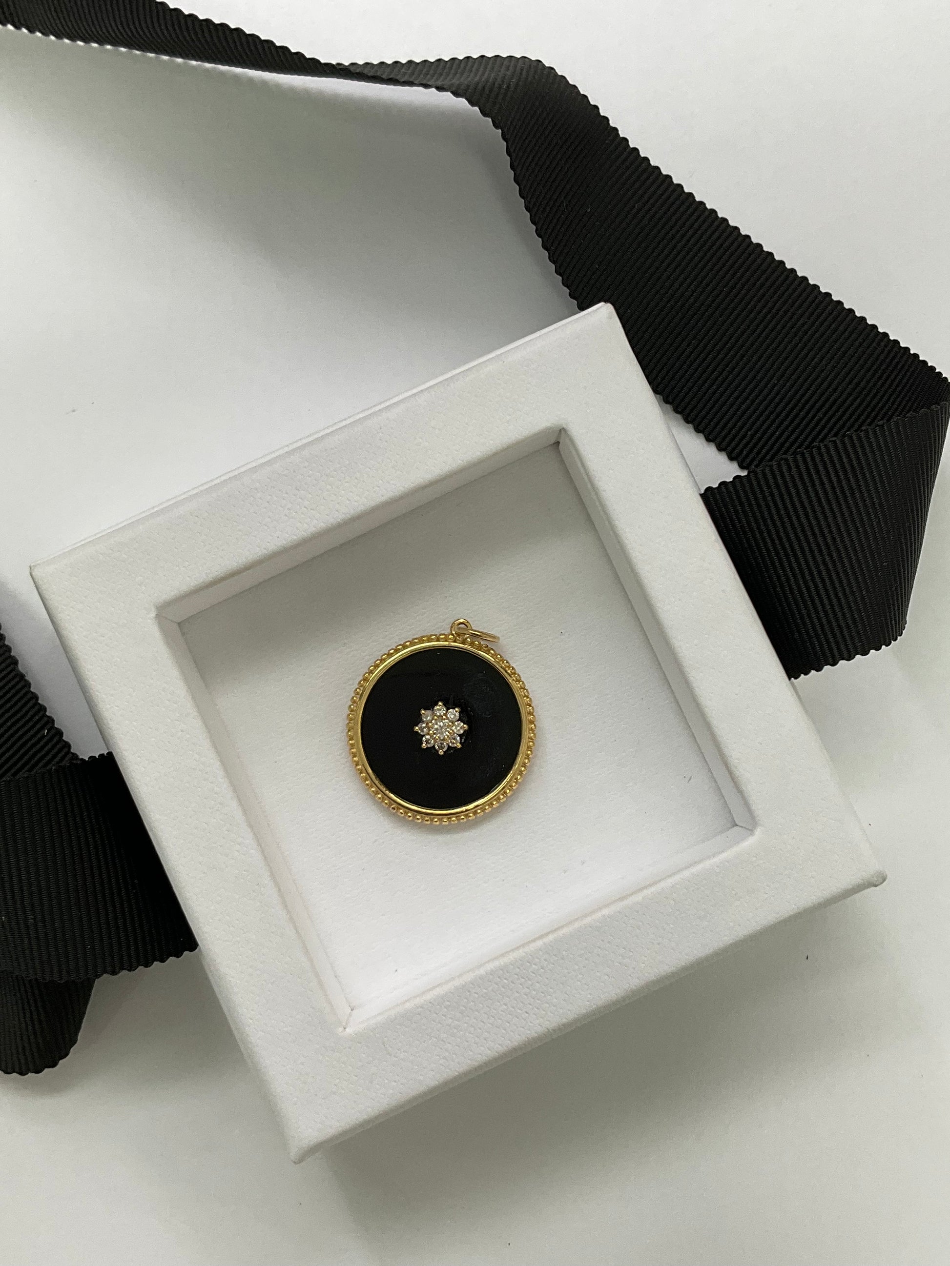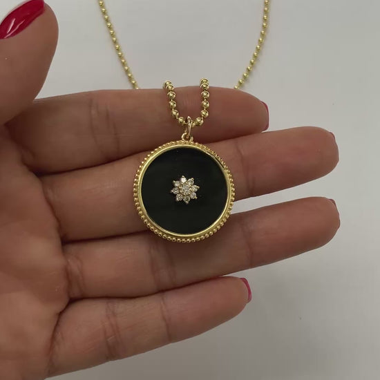 14K Gold Round Onyx Medallion Pendant with With Diamond Cluster