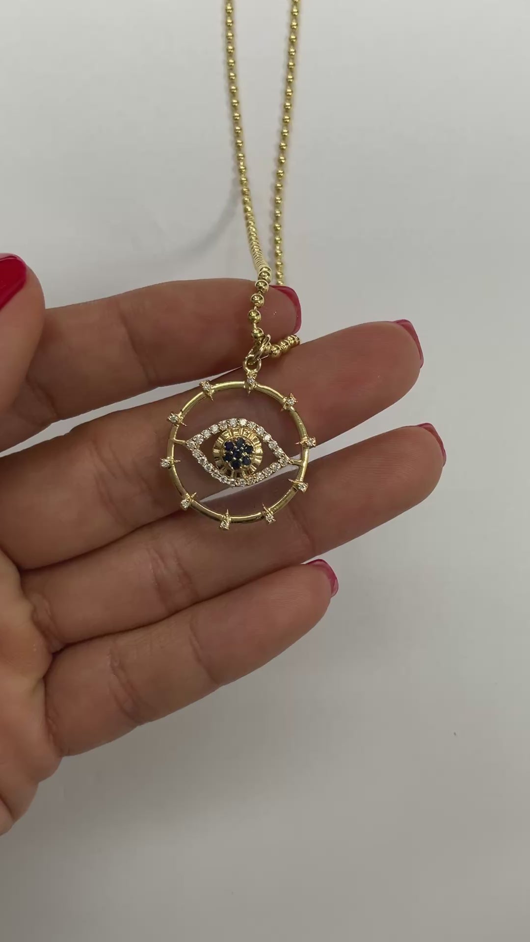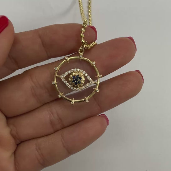 14KY Gold Round Clear Quartz Evil Eye Medallion Pendant with Diamonds And Sapphire